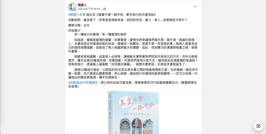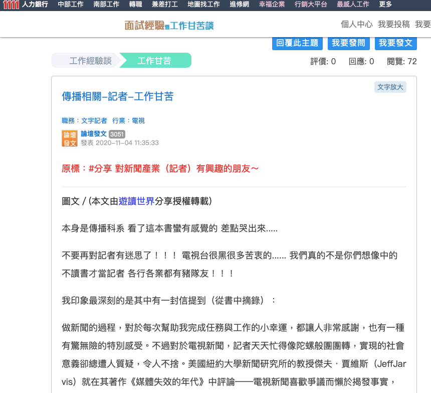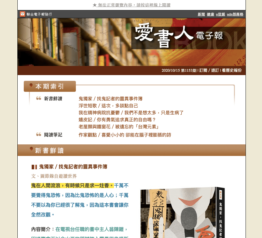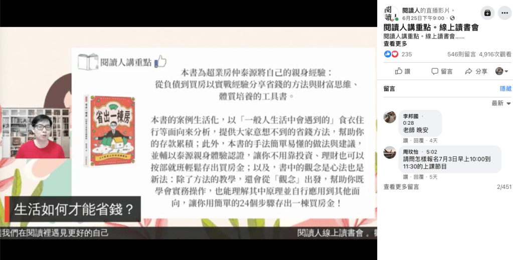 閱讀人直播分享,《NGU俱樂部》,《嵐姐好家在》Podcast,原民電視台,《幸福餐桌》Podcast,《台北早知道》,《源藝識》,留學代辦中心直播,《Paicelen 出力》,《歐舍咖啡》Podcast,POP radio,Hit FM,台中廣播,快樂聯播網,中央廣播電台,教育廣播電台,原民廣播電台,佳音廣播電台,東森《全民星攻略》,民視《台製日常》,正聲廣播電台,《故弄玄虛》Podcast,《阿善師鑑識實錄》Podcast,大千廣播電台,群健電視新春特別節目,《夢想家》Podcast,生鮮時書《不見面讀書會》,鄭匡宇《好奇人物》,香港CUP媒體。
