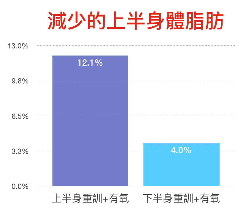 結果發現,進行上半身重量訓練的組別,上半身減少更多脂肪。