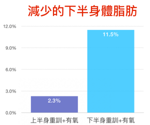 做深蹲後有氧的組別,燃燒掉的下半身脂肪是11.5%,而做上半身重訓後有氧的組別,下半身只燃燒了2.3%的脂肪。