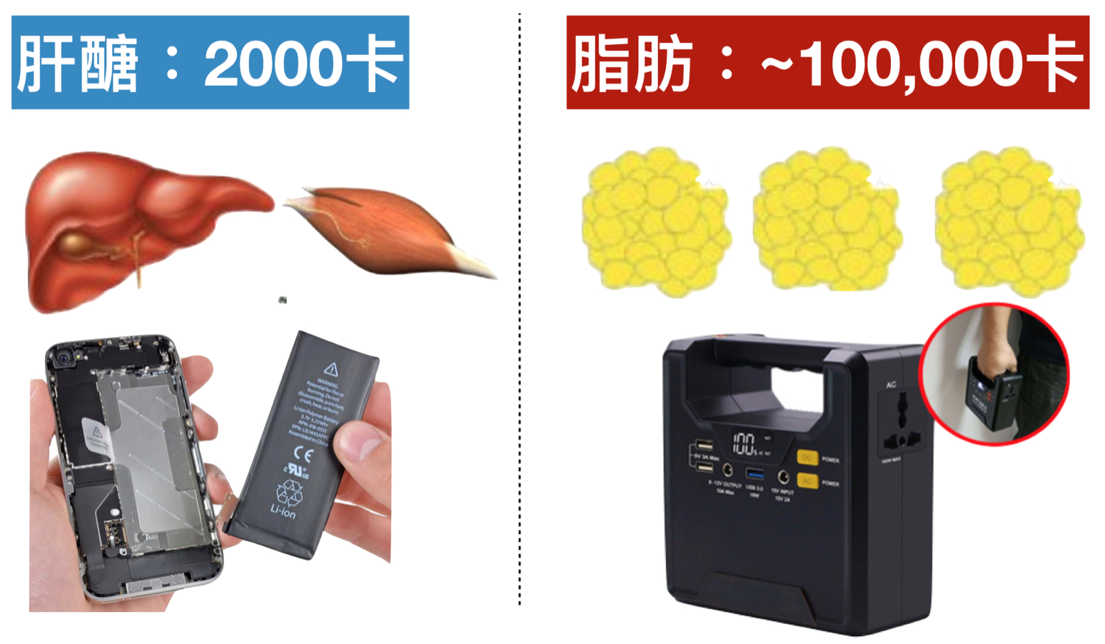 肝醣儲存在肝臟和肌肉裡面,肝醣就像是人體的電池,儲存空間小,一般人大概只有2000卡。如果你是一個嬌小的女生,又沒有什麼肌肉,身上儲存肝醣的空間可能只有800卡。